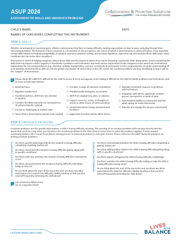 ASUP 2024ASSESSMENT OF SKILLS AND UNSOLVED PROBLEMS CHILDS NAME:DATE:NAMES OF CAREGIVERS COMPLETING THIS INSTRUMENT: STEP 1: SKILLS Whether neurotypical or neurodivergent, children communicate that