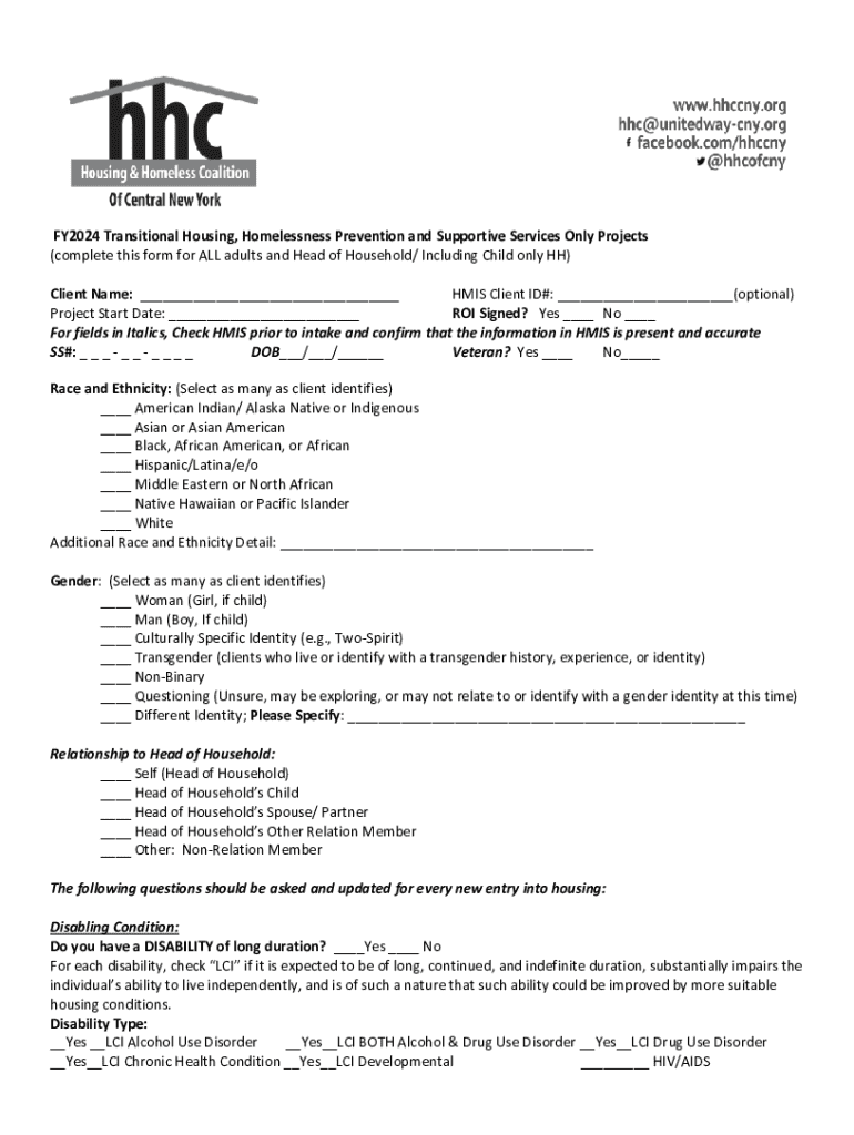 FY2024 Transitional Housing, Homelessness Prevention and Supportive Services Only Projects (complete this form for ALL adults and Head of Household/ Including Child only HH) Client Name: ___ HMIS