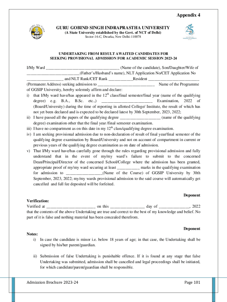 Appendix 4 GURU GOING SINGH INDRAPRASTHA UNIVERSITY (A State University established by the Govt. of NCT of Delhi) Sector16C, Dark, New Delhi110078UNDERTAKING FROM RESULT AWAITED CANDIDATES FOR SEEKING