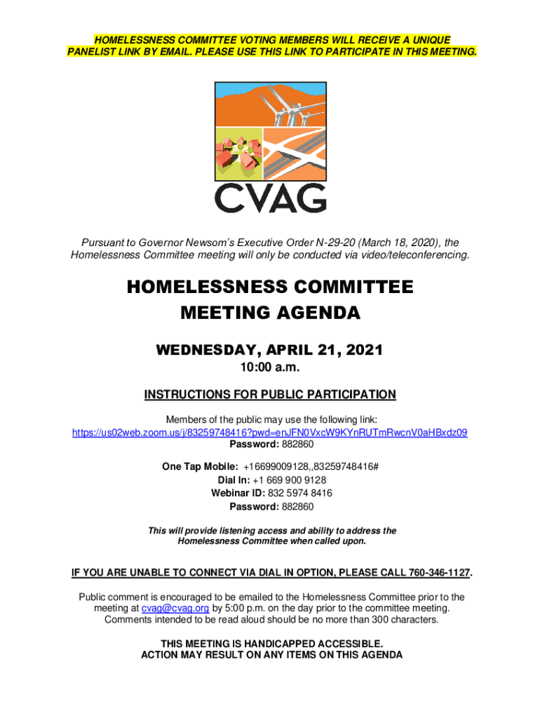 HOMELESSNESS COMMITTEE VOTING MEMBERS WILL RECEIVE A UNIQUE PANELIST LINK BY EMAIL. PLEASE USE THIS LINK TO PARTICIPATE IN THIS MEETING.Pursuant to Governor Newsoms Executive Order N2920 (March 18,