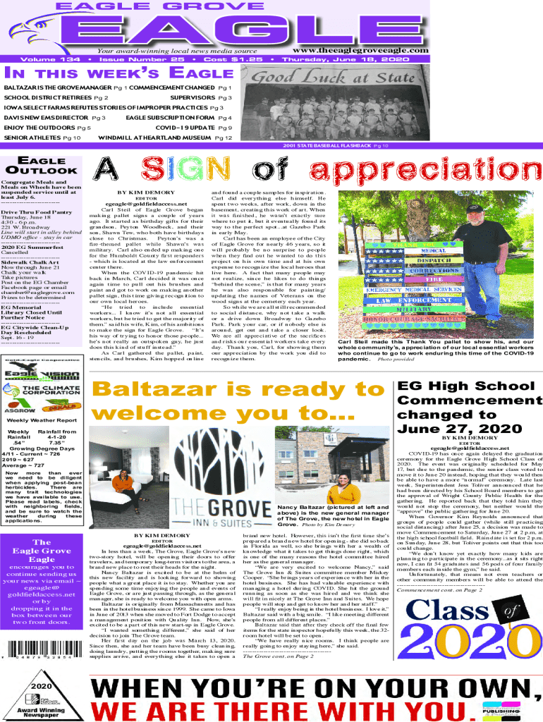 EAGLE GROVEEAGLEVolume 134INYour awardwinning local news media source Issue Number 25THIS WEEKSCost $1.25www.theeaglegroveeagle.comThursday, June 18, 2020EAGLEBALTAZAR IS THE GROVE MANAGER Pg 1 COMMENCEMENT