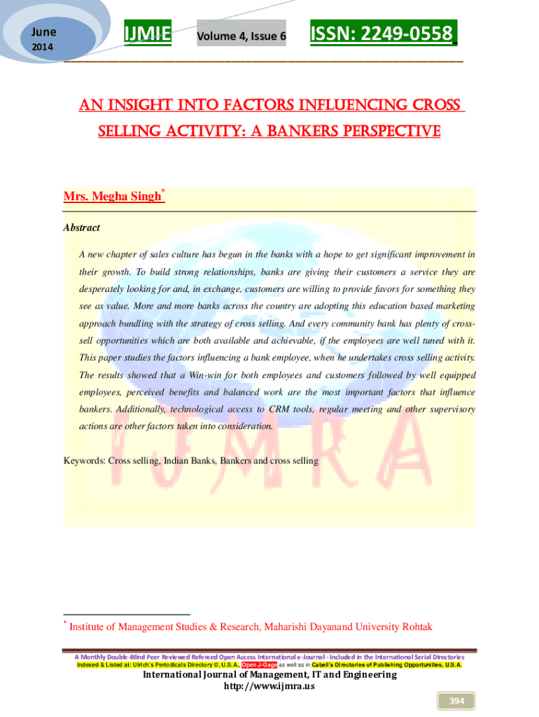 Get the free an Insight Into Factors Influencing Cross Selling Activity: a Bankers Perspective