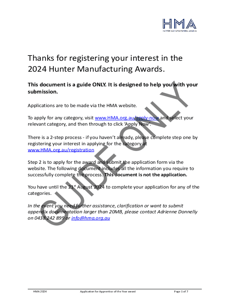 Thanks for registering your interest in the 2024 Hunter Manufacturing Awards.ON LYThis document is a guide ONLY. It is designed to help you with your submission. Applications are to be made via the
