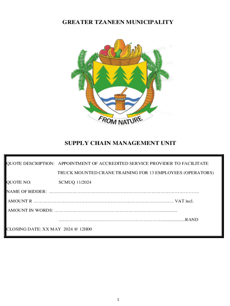 GREATER TZANEEN MUNICIPALITYSUPPLY CHAIN MANAGEMENT UNITQUOTE DESCRIPTION: APPOINTMENT OF ACCREDITED SERVICE PROVIDER TO FACILITATE TRUCK MOUNTED CRANE TRAINING FOR 13 EMPLOYEES (OPERATORS) QUOTE