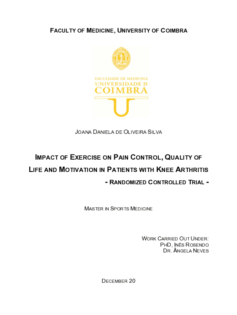 FACULTY OF MEDICINE, UNIVERSITY OF COIMBRAJOANA DANIELA DE OLIVEIRA SILVAIMPACT OF EXERCISE ON PAIN CONTROL, QUALITY OF LIFE AND MOTIVATION IN PATIENTS WITH KNEE ARTHRITIS RANDOMIZED CONTROLLED TRIAL