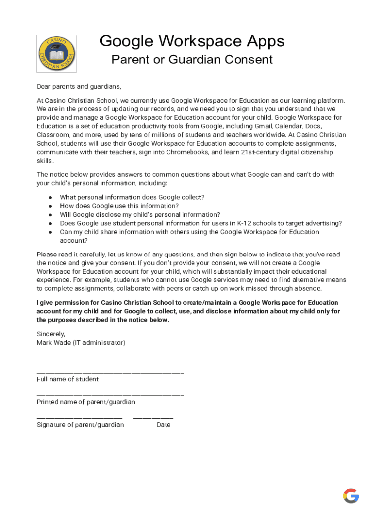 Google Workspace Apps Parent or Guardian Consent Dear parents and guardians, At Casino Christian School, we currently use Google Workspace for Education as our learning platform. We are in the process