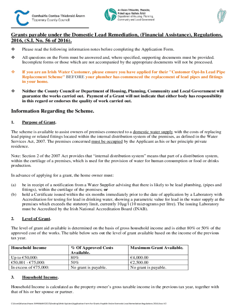 Grants payable under the Domestic Lead Remediation, (Financial Assistance), Regulations, 2016, (S.I. No. 56 of 2016). Please read the following information notes before completing the Application