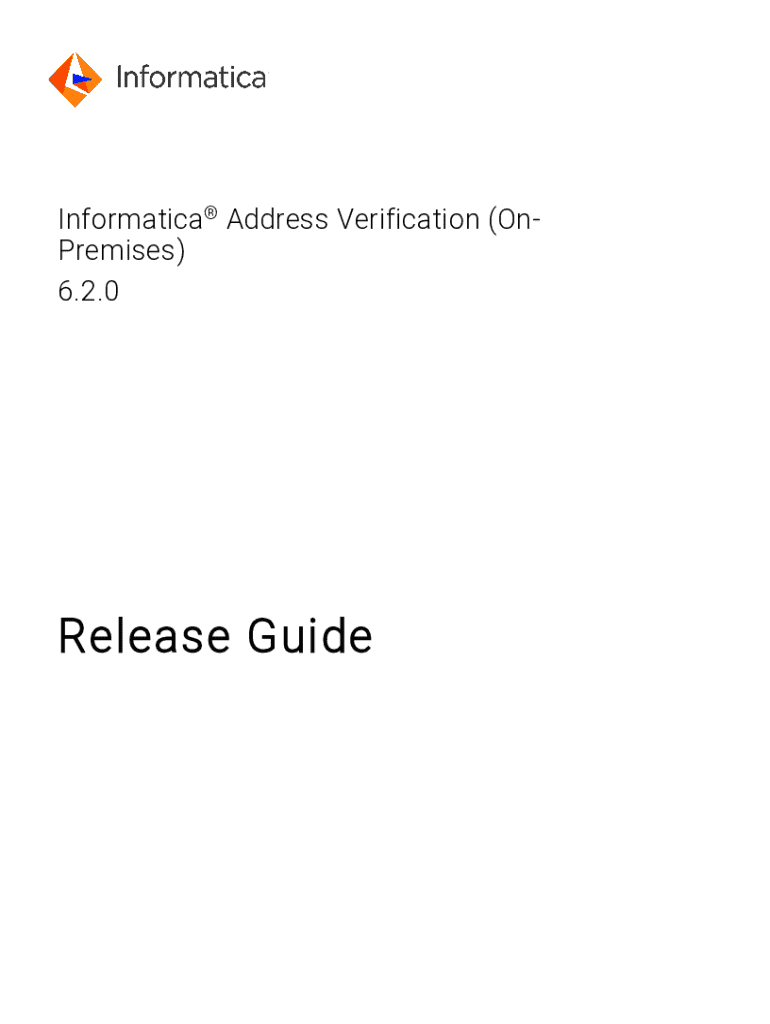 Informatica Address Verification (OnPremises) 6.2.0Release GuideInformatica Address Verification (OnPremises) Release Guide 6.2.0 May 2021 Copyright Informatica LLC 2013, 2021This software and documentation