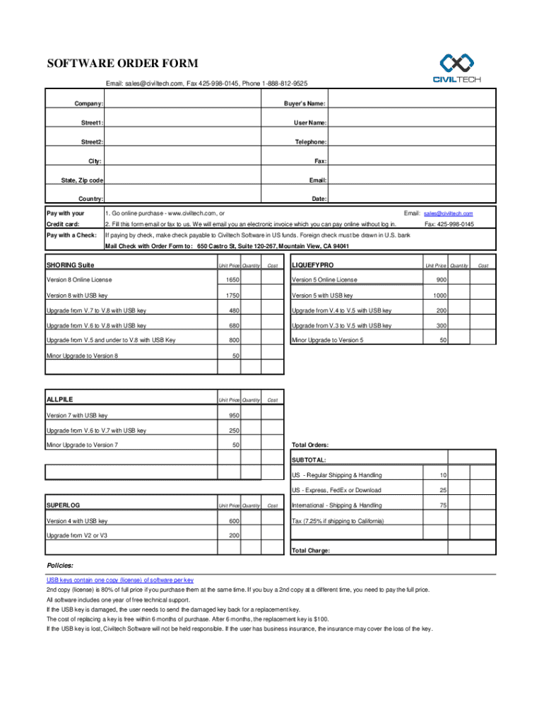 SOFTWARE ORDER FORM Email: sales@civiltech.com, Fax 4259980145, Phone 18888129525 Company:Buyer\'s Name:Street1:User Name:Street2:Telephone:City:Fax:State, Zip codeEmail:Country:Date:Pay with your1.