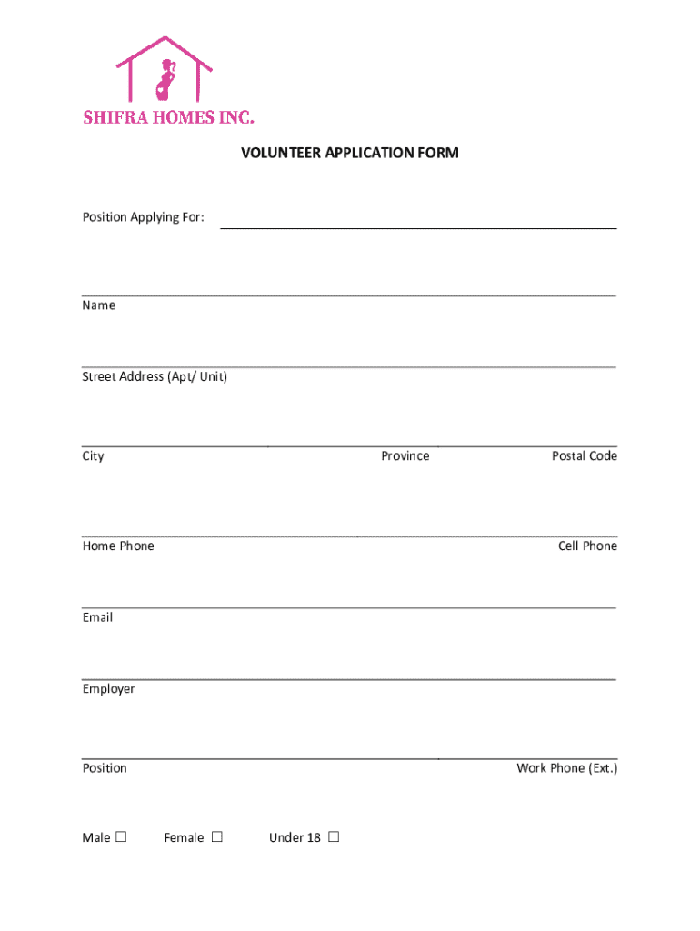 VOLUNTEER APPLICATION FORMPosition Applying For:NameStreet Address (Apt/ Unit)CityProvinceHome PhonePostal CodeCell PhoneEmailEmployerPositionMale Work Phone (Ext.)Female Under 18 Relevant Volunteer
