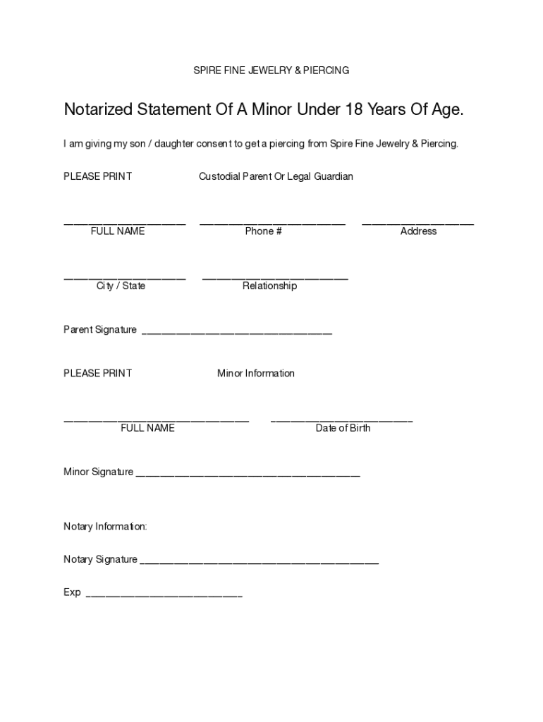 SPIRE FINE JEWELRY & PIERCINGNotarized Statement Of A Minor Under 18 Years Of Age.