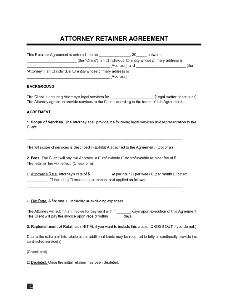 ATTORNEY RETAINER AGREEMENT This Retainer Agreement is entered into on ___, 20___ between ___ (the Client), an individual entity whose primary address is ___ [Address], and ___ (the Attorney), an
