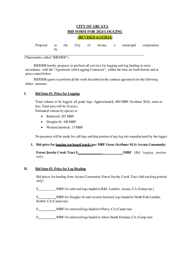Get the free CITY OF ARCATA BID FORM FOR 2024 LOGGING (REVISED 6/14 ...