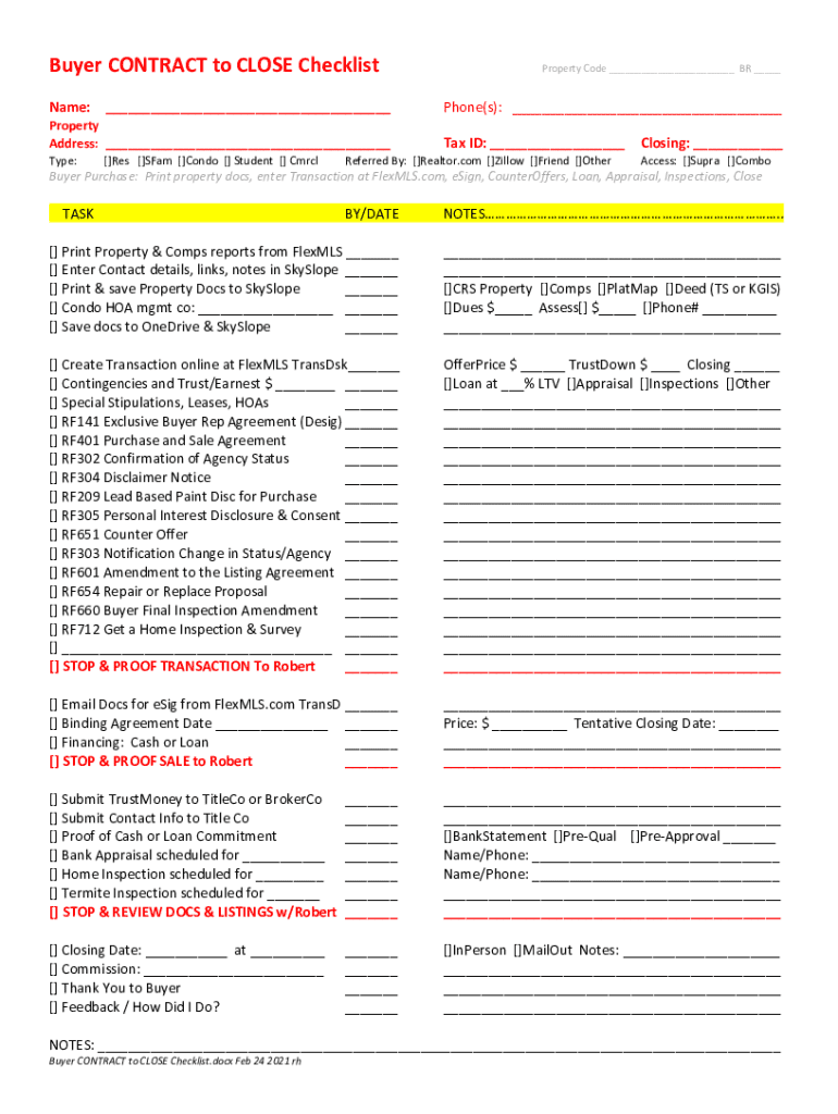 Buyer CONTRACT to CLOSE Checklist Name: ___Property Address: ___ Type:[]Res []SFam []Condo [] Student [] CmrclProperty Code ___ BR ___Phone(s): ___ Tax ID: ___Referred By: []Realtor.com []Zillow []Friend