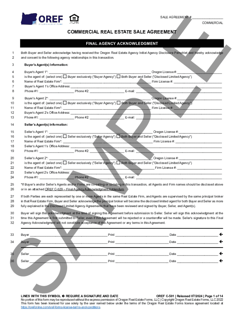 SALE AGREEMENT # ___ COMMERCIALCOMMERCIAL REAL ESTATE SALE AGREEMENT1 2PL FINAL AGENCY ACKNOWLEDGMENTBoth Buyer and Seller acknowledge having received the Oregon Real Estate Agency Initial Agency