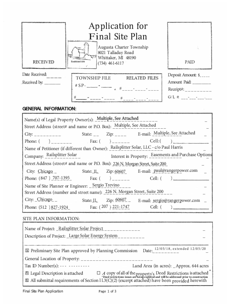 RECEIVEDEstablished 1836Date Received:_ _ _ _ Received by: ___Ap plication for Fi nal Site PlanAugusta Charter Township 8021 Talladay Road Whittaker, MI 48190 (734) 4616117TOWNSHIP FILE # SP#RELATED