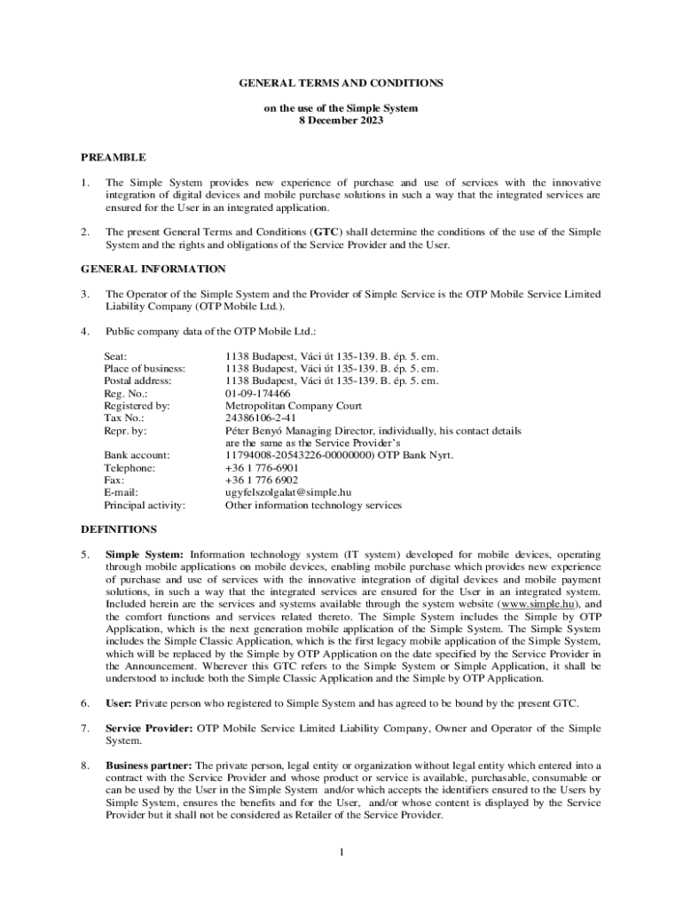 GENERAL TERMS AND CONDITIONS on the use of the Simple System 8 December 2023PREAMBLE 1.The Simple System provides new experience of purchase and use of services with the innovative integration of