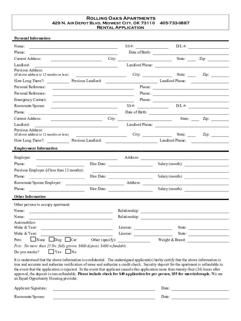 Rolling Oaks Apartments429 N. Air Depot Blvd, Midwest City, OK 73110Rental Application4057330887Personal Information Name:SS #:Phone’D/L #:Date of Birth:Current Address:City:Landlord: Previous Address:State:Zip:Landlord