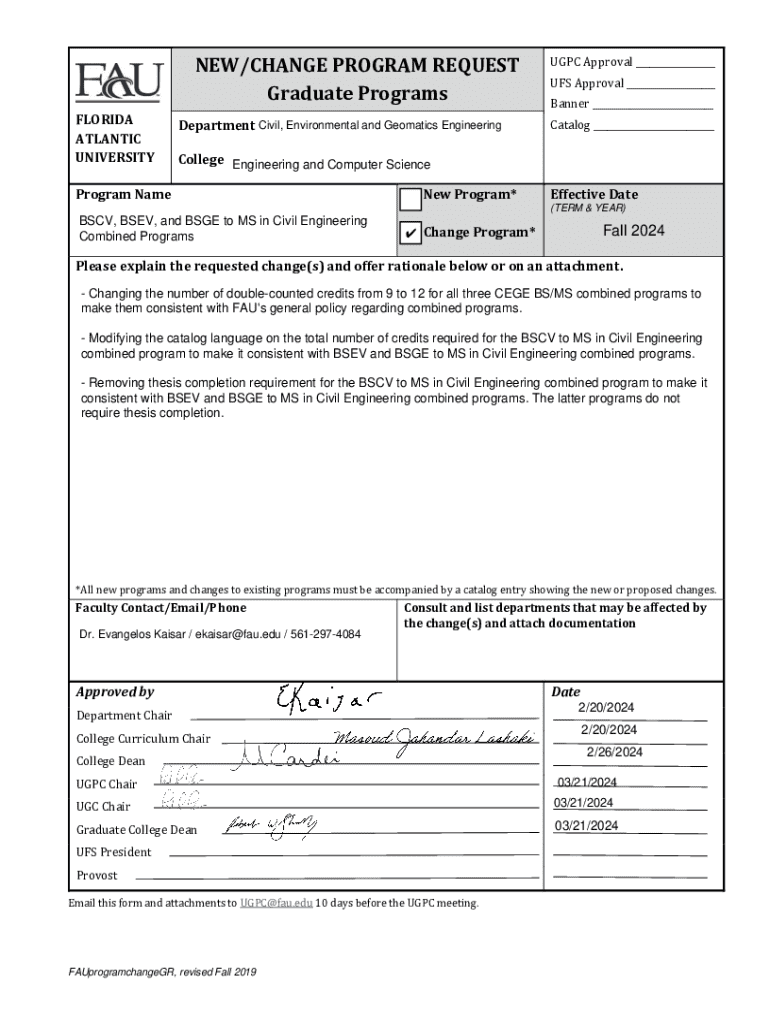 NEW/CHANGE PROGRAM REQUEST Graduate Programs FLORIDA ATLANTIC UNIVERSITYDepartment Civil, Environmental and Aromatics EngineeringUGPC Approval ___ UFS Approval ___ Banner ___ Catalog ___College Engineering