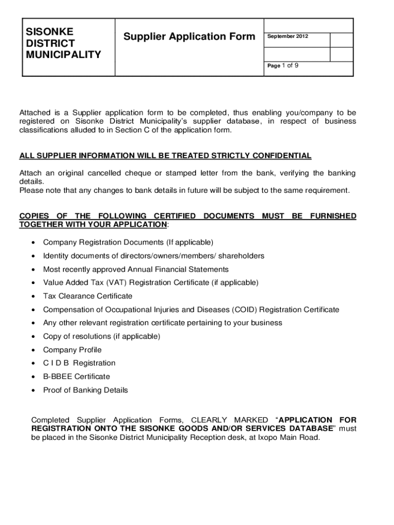 Complete the Supplier Application Form to register on Simone District Municipality’s supplier database, ensuring all necessary documents are attached for processing.