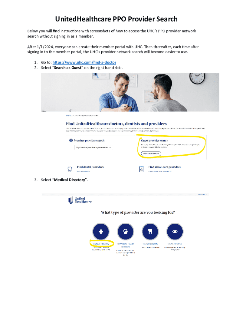 UnitedHealthcare PPO Provider Search Below you will nd instrucons with screenshots of how to access the UHCs PPO provider network search without signing in as a member. Aer 1/1/2024, everyone can