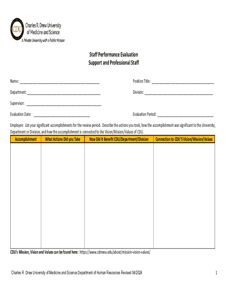 Staff Performance Evaluation Support and Professional Staff Name: ___Position Title: ___Department: ___Division: ___Supervisor: ___ Evaluation Date: ___Evaluation Period: ___Employee: List your significant