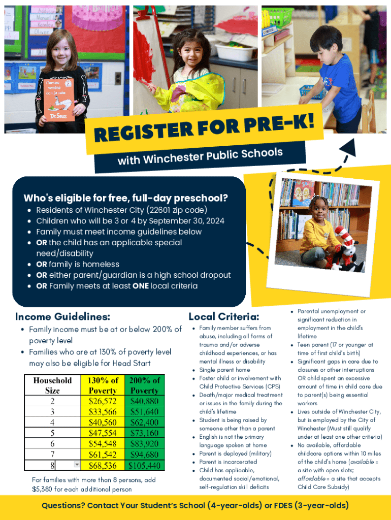 ! K E R P R O F R REGISTER public Schools with Winchester Who\'s eligible for free, full day preschool? Residents of Winchester City (22601 zip code) Children who will be 3 or 4 by September 30, 2024,