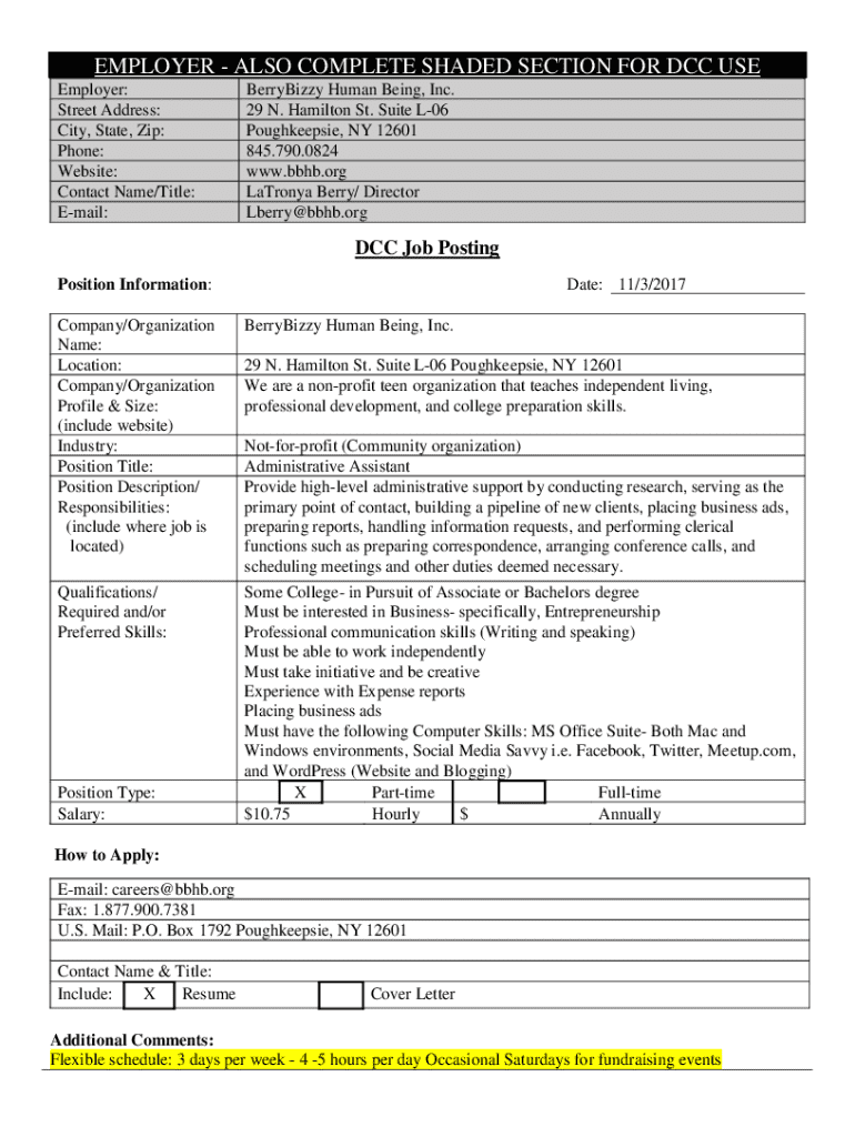 EMPLOYER ALSO COMPLETE SHADED SECTION FOR DCC USE Employer: Street Address: City, State, Zip: Phone: Website: Contact Name/Title: Email:BerryBizzy Human Being, Inc. 29 N. Hamilton St. Suite L06 Poughkeepsie,