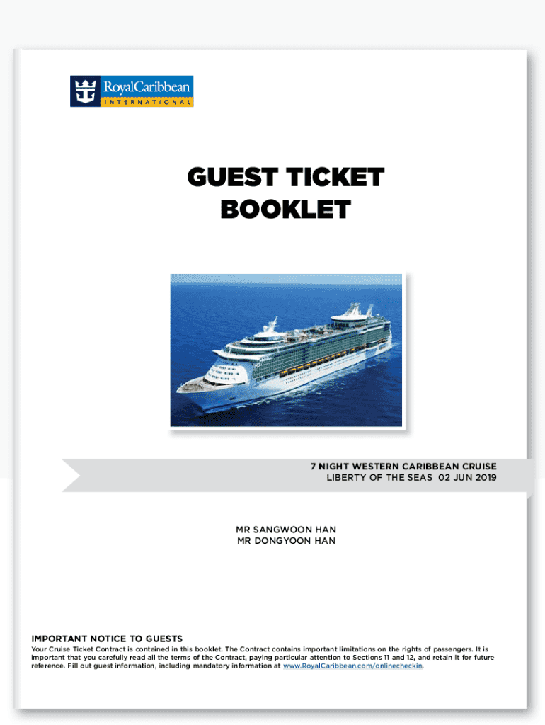 GUEST TICKET BOOKLET7 NIGHT WESTERN CARIBBEAN CRUISE LIBERTY OF THE SEAS 02 JUN 2019MR SANGWOON HAN MR DONGYOON HANIMPORTANT NOTICE TO GUESTS Your Cruise Ticket Contract is contained in this booklet.