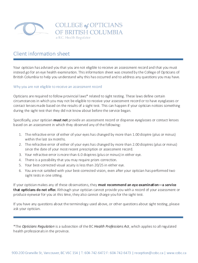 Your optician has advised you that you are not eligible to receive an assessment record and that you must