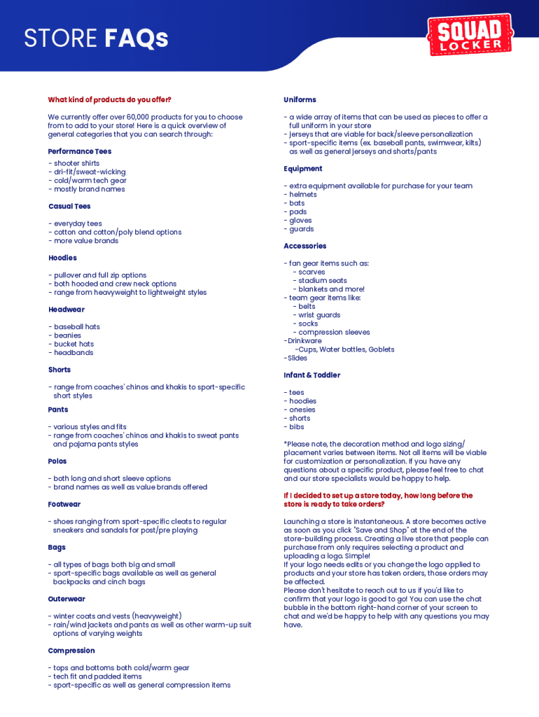 STORE FAQs What kind of products do you offer?UniformsWe currently offer over 60,000 products for you to choose from to add to your store! Here is a quick overview of general categories that you can