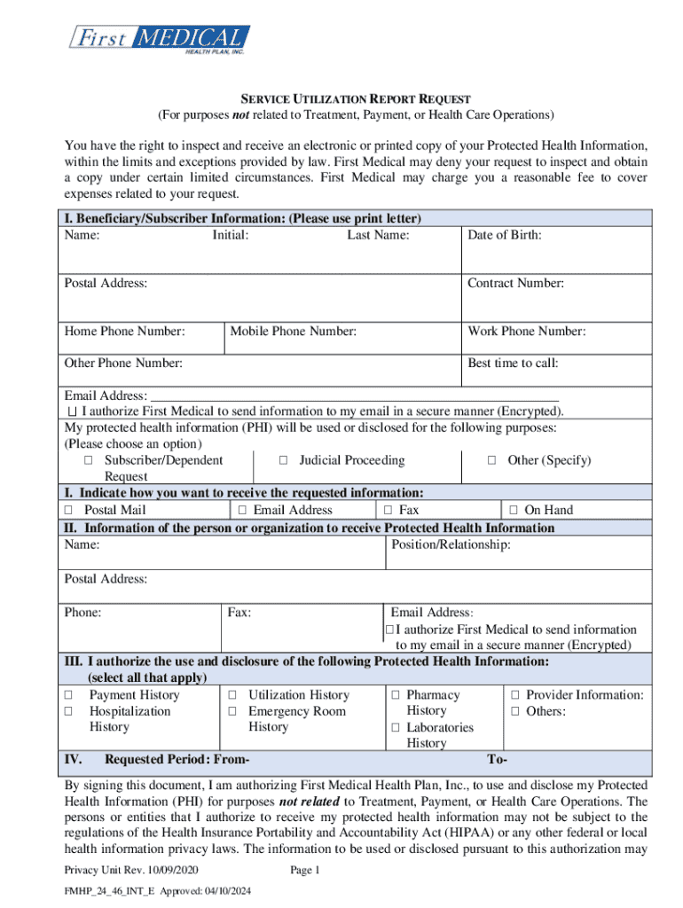 SERVICE UTILIZATION REPORT REQUEST (For purposes not related to Treatment, Payment, or Health Care Operations) You have the right to inspect and receive an electronic or printed copy of your Protected