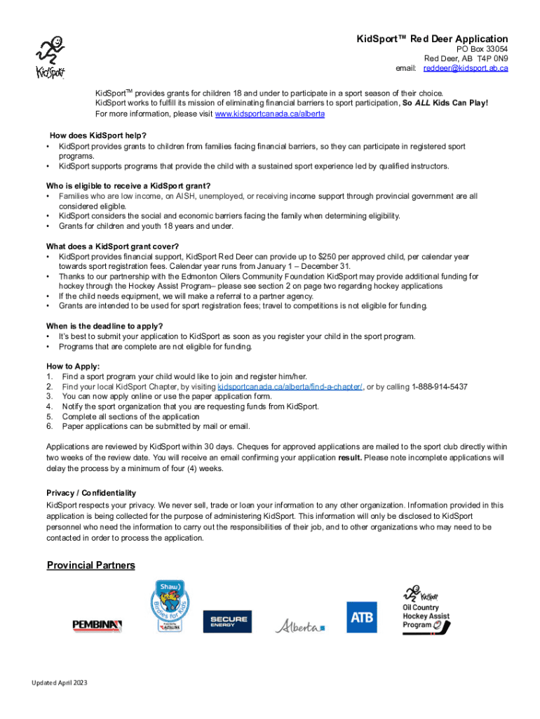 Parents or guardians of children who require financial assistance to participate in sports and physical activities are required to file Kidsport Red Deer application.