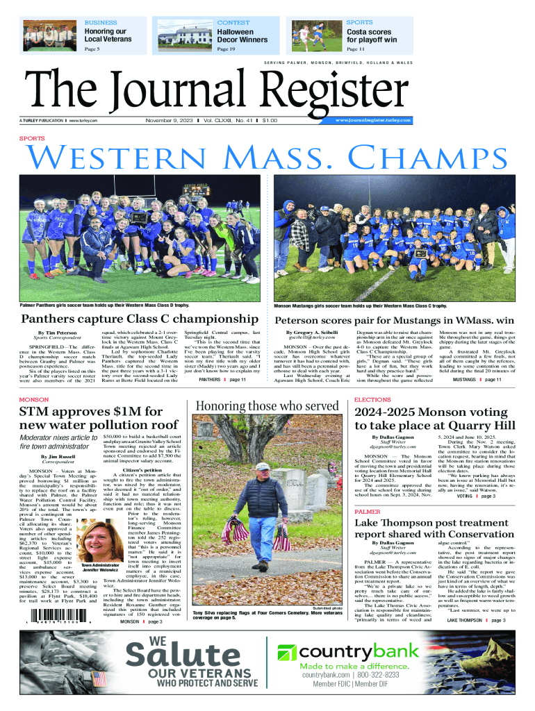 BUSINESSCONTESTSPORTSHonoring our Local VeteransHalloween Decor WinnersCosta scores for playoff winPage 5Page 19Page 11The Journal RegisterSERVING PALMER, MONSON, BRIMFIELD, HOLLAND & WALESA TURLEY