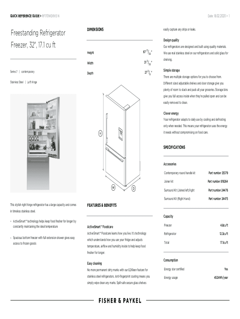 QUICK REFERENCE GUIDE RF170WDRX5 Freestanding RefrigeratorDate: 18.02.2020 1DIMENSIONSeasily capture any drips or leaks. Design qualityFreezer, 32\”, 17.1 cu four refrigerators are designed and