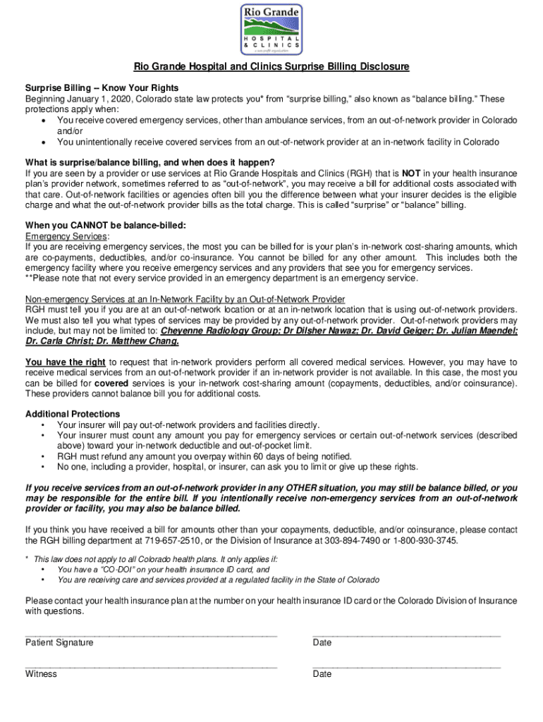 Rio Grande Hospital and Clinics Surprise Billing Disclosure Surprise Billing Know Your Rights Beginning January 1, 2020, Colorado state law protects you* from surprise billing, also known as balance