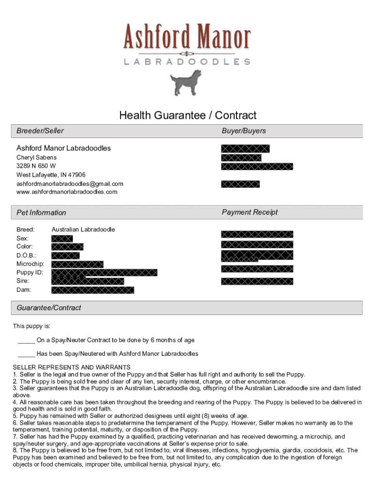 Health Guarantee / Contract Breeder/SellerBuyer/BuyersAshford Manor Labradoodles Cheryl Sabens 3289 N 650 W West Lafayette, IN 47906 ashfordmanorlabradoodles@gmail.com www.ashfordmanorlabradoodles.comPet