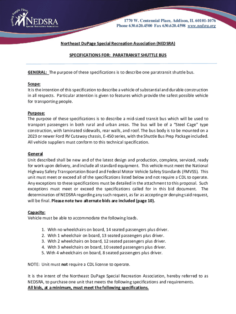 Page 1 of 111770 W. Centennial Place, Addison, IL 601011076 Phone 630.620.4500 Fax 630.620.4598 www.nedsra.orgNortheast DuPage Special Recreation Association (NEDSRA) SPECIFICATIONS FOR: PARATRANSIT