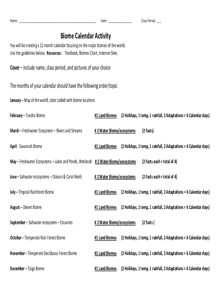 Name: ___Date: ___Class Period: ___Biome Calendar Activity You will be creating a 12 month calendar focusing on the major biomes of the world. Use the guidelines below. Resources: Textbook, Biomes