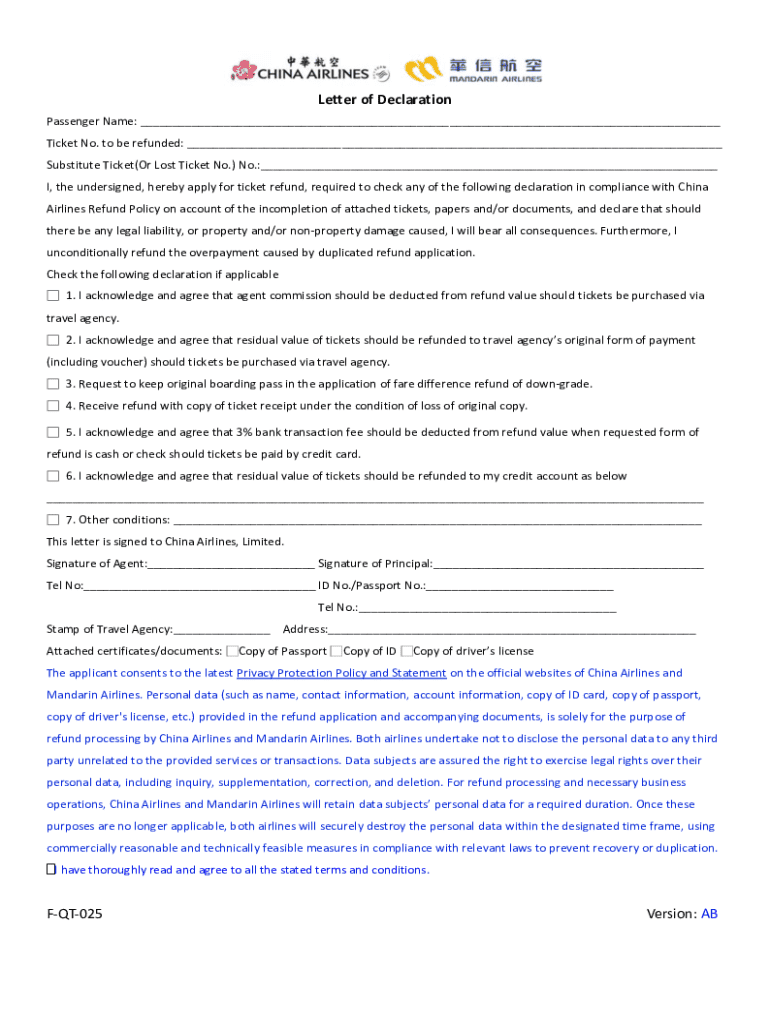 Letter of Declaration Passenger Name: ___ Ticket No. to be refunded: ___ Substitute Ticket(Or Lost Ticket No.) No.:___ I, the undersigned, hereby apply for ticket refund, required to check any of