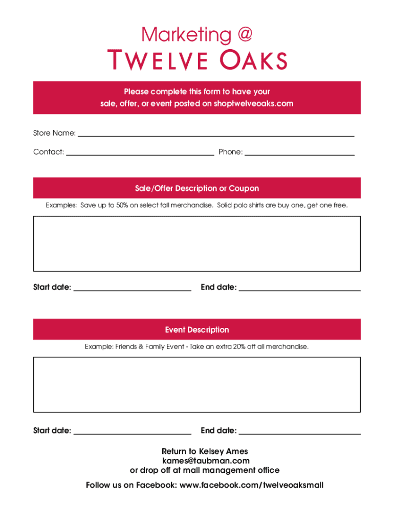 Marketing @ Please complete this form to have your sale, offer, or event posted on shoptwelveoaks.comatose Name: Contact:Phone:Sale/Offer Description or Coupon Examples: Save up to 50% on select fall