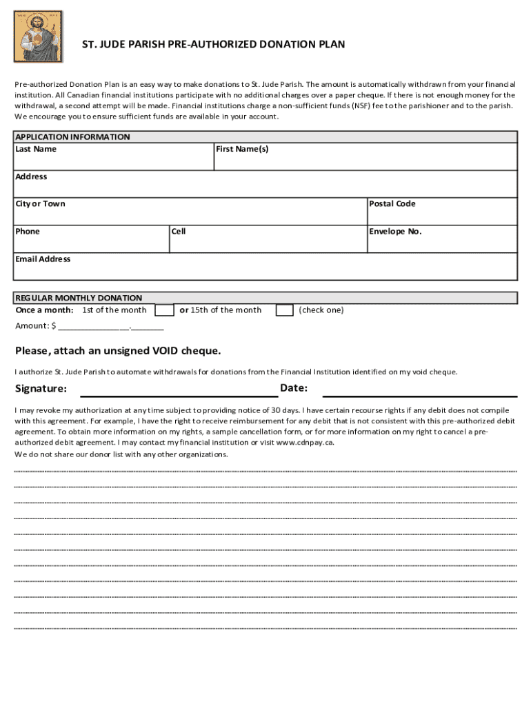 ST. JUDE PARISH PREAUTHORIZED DONATION PLAN Preauthorized Donation Plan is an easy way to make donations to St. Jude Parish. The amount is automatically withdrawn from your financial institution.