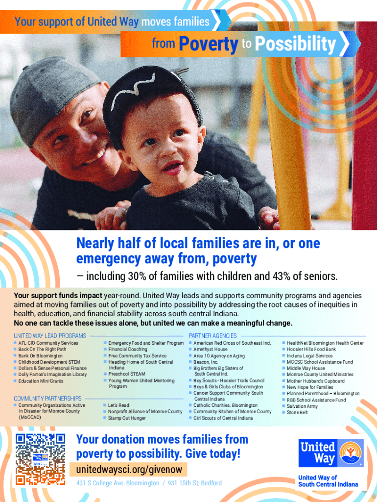 Nearly half of local families are in, or one emergency away from, poverty including 30% of families with children and 43% of seniors. Your support funds impact year round. United Way leads and supports