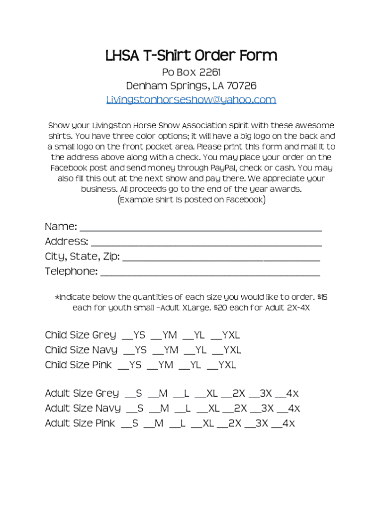 LISA Shirt Order Form Po Box 2261 Den ham Springs, LA 70726 Livingstonhorseshow@yahoo.com Show your Livingston Horse Show Association spirit with these awesome shirts. You have three color options;