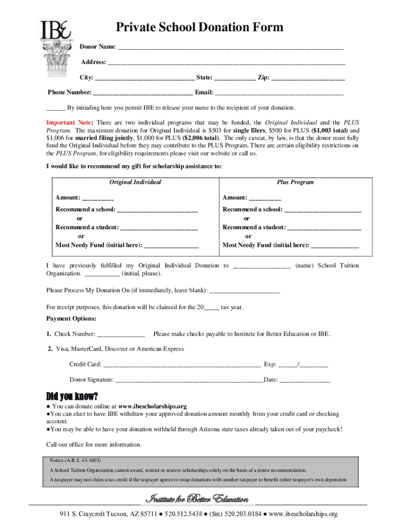 Private School Donation Form Donor Name: ___ Address: ___ City: ___ State: ___ Zip: ___ Phone Number: ___ Email: ___ ___ By initialing here you permit IBE to release your name to the recipient of