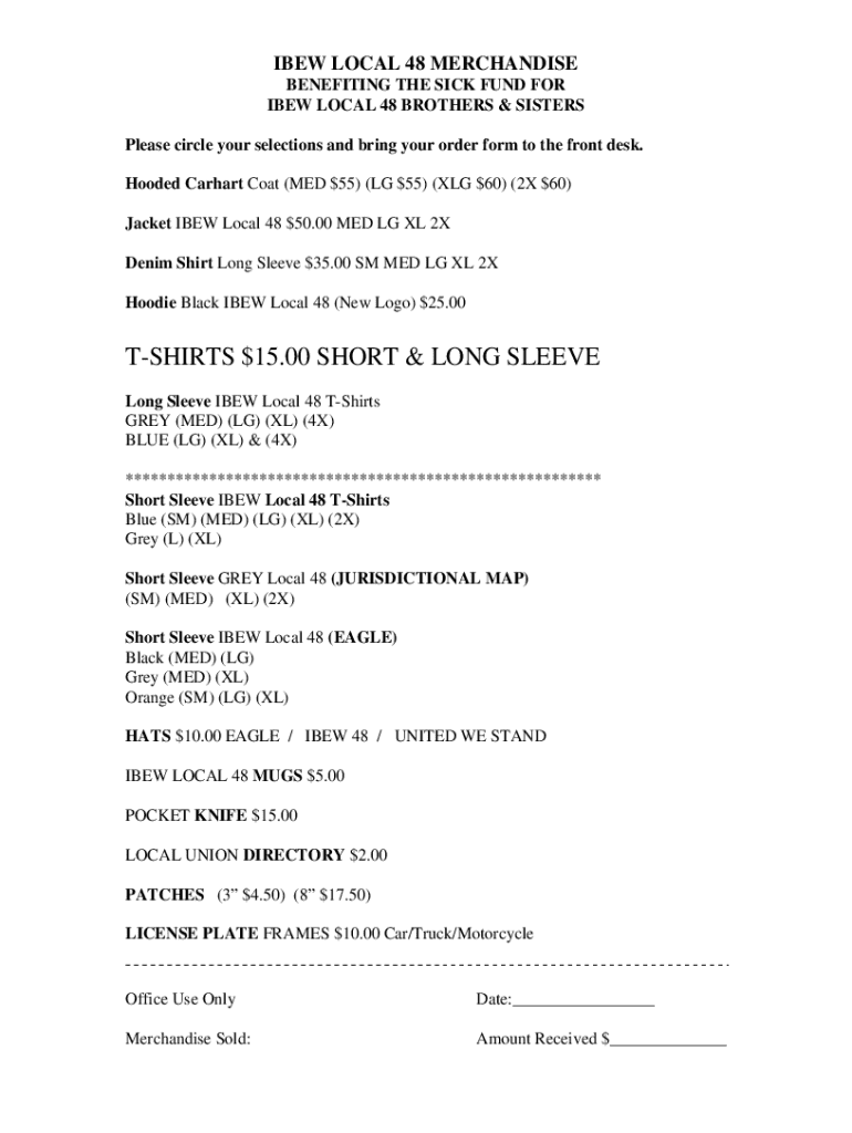 IBEX LOCAL 48 MERCHANDISE BENEFITING THE SICK FUND FOR IBEX LOCAL 48 BROTHERS & SISTERS Please circle your selections and bring your order form to the front desk. Hooded Earhart Coat (MED $55) (LG