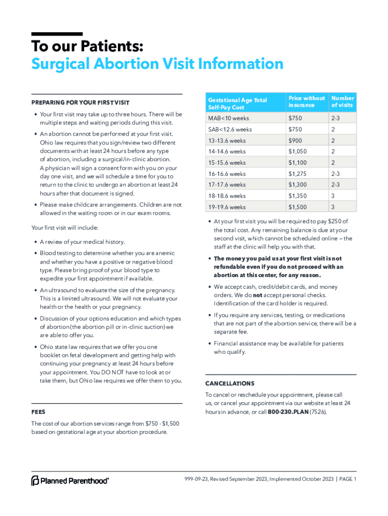To our Patients: Surgical Abortion Visit Information ___ PREPARING FOR YOUR FIRST VISIT Your first visit may take up to three hours. There will be multiple steps and waiting periods during this visit.