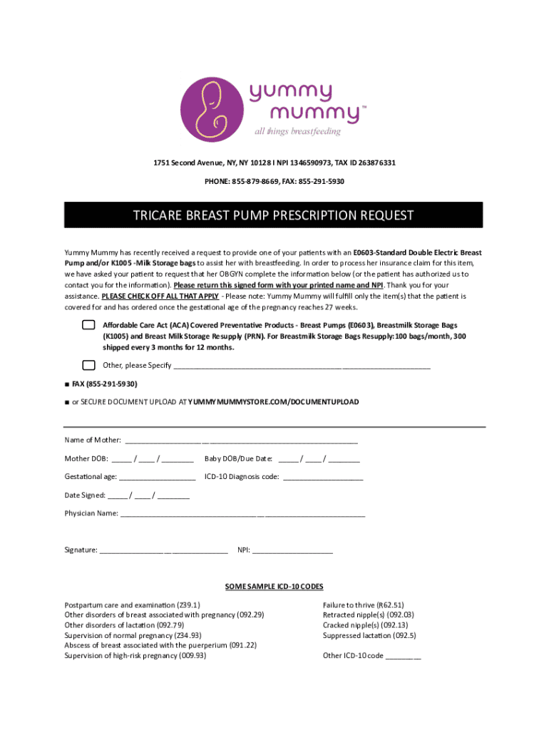 1751 Second Avenue, NY, NY 10128 I NPI 1346590973, TAX ID 263876331 PHONE: 8558798669, FAX: 8552915930TRICARE BREAST PUMP PRESCRIPTION REQUEST Yummy Mummy has recently received a request to provide