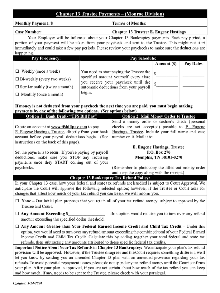 Chapter 13 Trustee Payments (Monroe Division) Monthly Payment: term/# of Months:Case Number: Chapter 13 Trustee: E. Eugene Hastings Your Employer will be informed about your Chapter 13 Bankruptcy