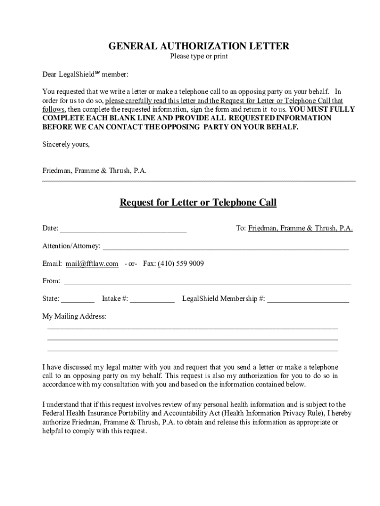GENERAL AUTHORIZATION LETTER Please type or printer LegalShield member: You requested that we write a letter or make a telephone call to an opposing party on your behalf. In order for us to do so,